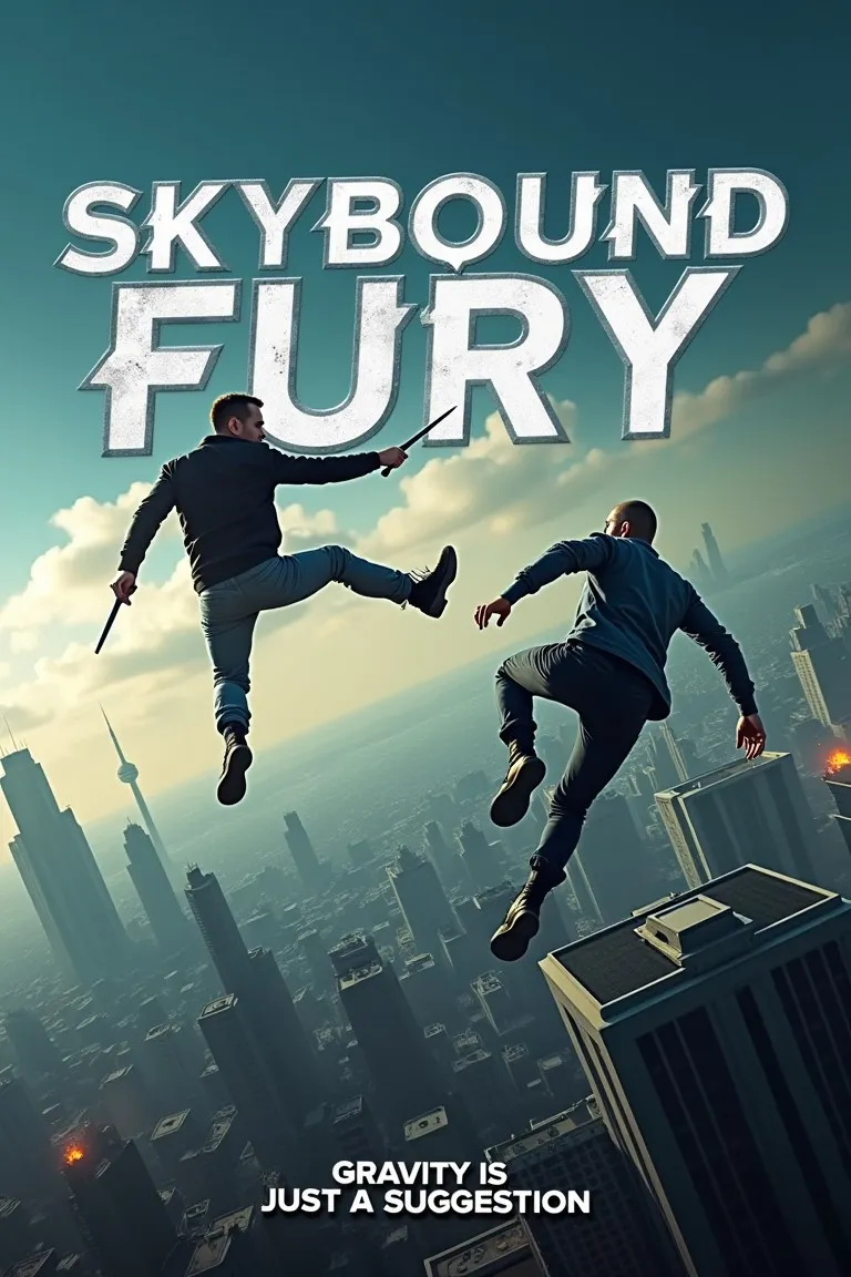 Action movie poster, high-flying/sci-fi: title “Skybound Fury” in a sleek, futuristic font with sharp edges, like Audiowide, positioned at the top. Two figures engaged in a mid-air fight, high above a sprawling city. One is falling, the other is leaping after them, weapons drawn. Tagline: “Gravity is just a suggestion” in a smaller font at the bottom