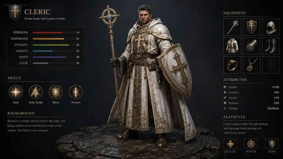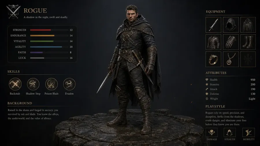 Describe the character the way you already imagine them. The class, the era, the silhouette, the palette, the art style, the mood.